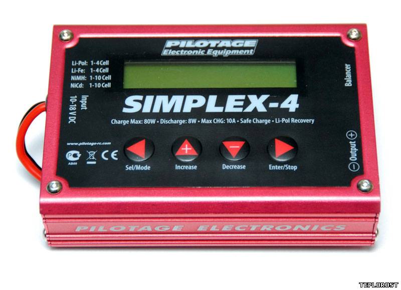 Применяется для заряда- разряда Никель- кадмиевых или Никель– металгидридных аккумуляторов (Ni-Cd, Ni-MH). * Возможна одновременная зарядка силовых аккумуляторов, аккумуляторов передатчика и приёмника; * Автоматическое отключение после полного заряда силового аккумулятора; * Функция разряда аккумуляторов, для повышения срока их службы; * На дисплее отображается ток заряда силового аккумулятора; * Устройство заряжает от 4 до 8 силовых банок; * От 4 до 5 банок бортового аккумулятора; * От 6ти до 8ми банок аккумулятора передатчика; * Регулируемый ток заряда силовых аккумуляторов в диапазоне от 0,1А до 4.5А; * Ток разряда силовых аккумуляторов фиксированный, * Ток заряда аккумуляторов передатчика и приёмника фиксированный 150mA; * Защита от неправильного подключения аккумуляторов; * В комплект, включён температурный датчик для предотвращения перезаряда NI-MH аккумуляторов; * Комбинированное питание зарядного устройства: либо от 12ти вольт постоянного тока, либо от сети 220 вольт переменного тока.