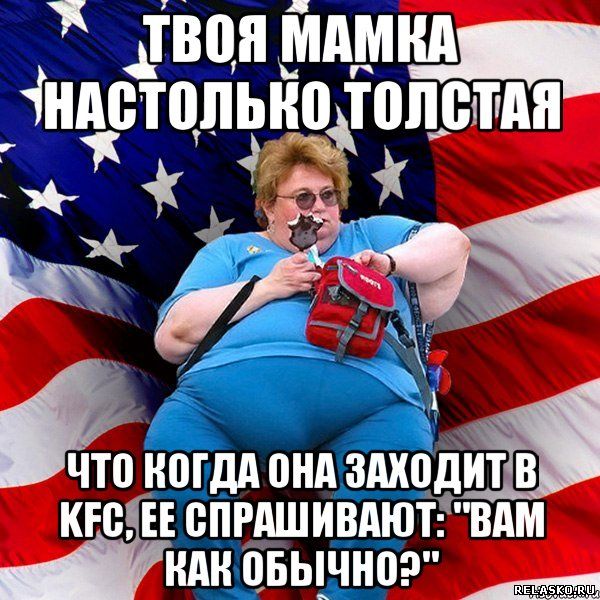 - она использует матрас как прокладку - НАСА планирует закрыть ею озоновую дыру - ее параметры - 200-200-200, и это только ее левая рука! - однажды пукнув, она вывела себя на орбиту - она могла бы быть восьмым континентом - когда она одевает свитер с буквой "Х", то вертолеты пытаются приземлится на нее - ее засекает радар - ей нужна карта, чтобы найти собственную задницу - каскадерские агенства предлагают ей работу в качестве страховочного батута - ее nickname - "Сало" - людей водят к ней на экскурсии - она пошла в кино и загородила экран всем(!) рядам - когда она плавала в море, испанцы подплыв к ней, заявили, что открыли новые земли - приходит в ресторан, смотрит в меню, закрывает его и говорит -"Хорошо, принесите!" - ей приходится гладить свои трусы разложив их на летном поле - когда она прыгает с тарзанки, вслед за ней обрушивается и мост - у нее есть свой индекс - НАСА запустило вокруг нее спутник - даже Биллу Гейтсу не оплатить ее липосакцию - когда она приходит в парк аттракционов, люди пытаются на ней прокатиться - когда она загорает на пляже, никому не хватает солнца - когда она прыгает с тарзанки, она пападает сразу в ад - когда она гуляет на высоких каблуках, то с каждым шагом открывает новое месторождение нефти - люди прыгают с моста на ее резинке от трусов - когда я пытался объехать ее на машине, у меня закончился бензин - она может одновременно находится в двух часовых поясах - кода она загорает на пляже, Гринпис пытается спасти ее, оттащив ее обратно в воду - у тебя есть ее единственная фотография - со спутника - ее привязывают за плечи к экскаваторам и протаскивают сквозь туннель, чтобы прочистить его