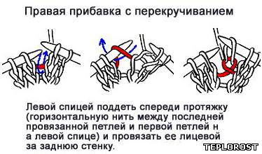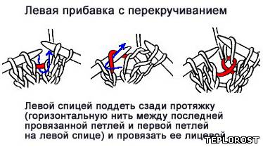 Следующий ряд с перехлестом: 10 п. платочной вязкой, отложить 12 п. на вспом.спицу за работу, *2 лиц.п., 2 изн.п.**, повторить *...** 3 раза, затем провязать петли со вспом.спицы *2 лиц.п., 2 изн.п.**, повторить *...** 3 раза, далее провязать 20 п. платочной вязкой.