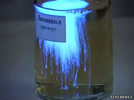 люминол (продается в магазинах, торгующих химреактивами) – 2-3 г; перекись водорода 3% (из аптеки) – 80 мл; вода – 100 мл; медный купорос (хлорное железо, красная кровяная соль) – 3 г; раствор едкого натра – 10 мл; флуоресцентные красители – рубрен, бриллиантовый зеленый и т.д. пробирки (колбы, прозрачные стеклянные емкости). Изготовление Люминол порошок желтого цвета, который в кислых и нейтральных растворах начинает светиться голубым цветом. Так что не зря он стоит в рецепте на первом месте, без люминола опыт не удастся. Наливаем в колбу воду, растворяем в ней люминол. Добавляем в колбу перекись водорода. Туда же отправляем медный купорос или хлорное железо, или красную кровяную соль. Если не нашлось ни того, ни другого, ни третьего, можно обойтись подручными средствами. Выдавливаем из куриного окорочка немного крови, разводим ее в воде и добавляем 1 ст. ложку этого раствора к смеси в колбе. Добавляем в колбу едкий натр.