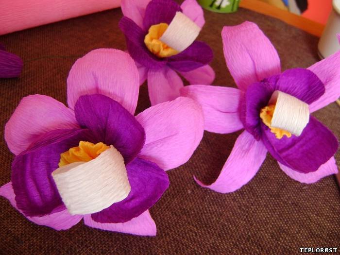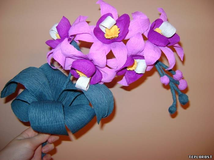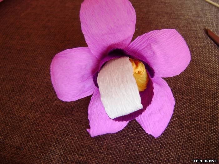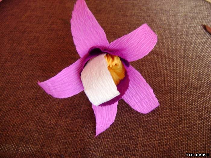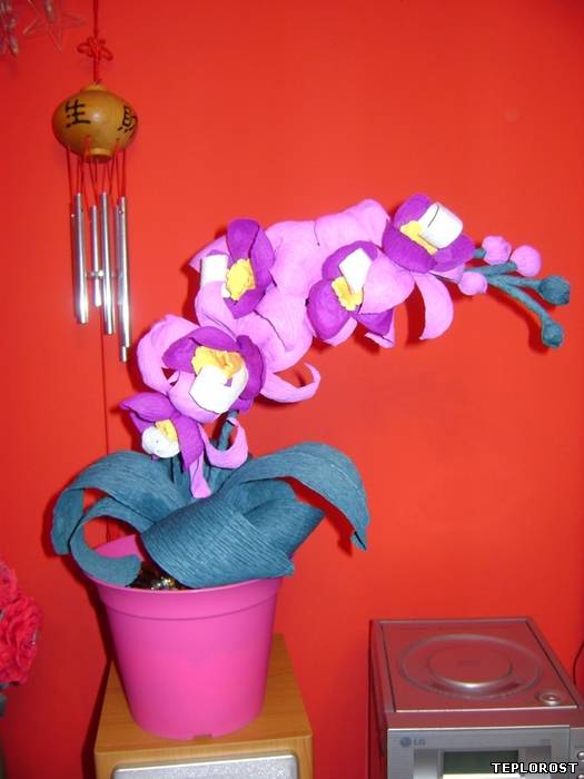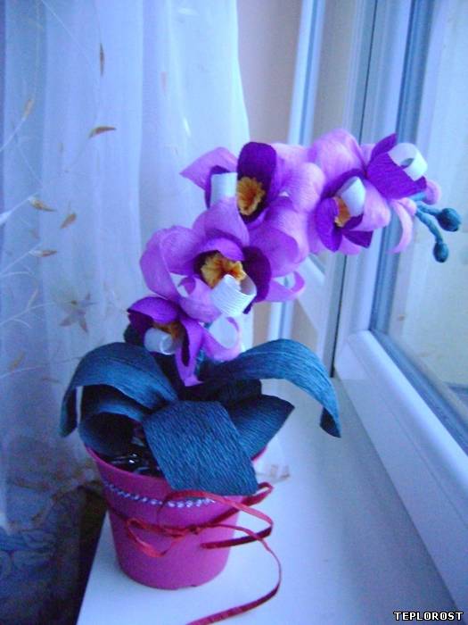 Вот такая орхидея из гофрированной бумаги сможет украсить интерьер вашей кухни или послужить дополнением к конфетному букету в подарок.