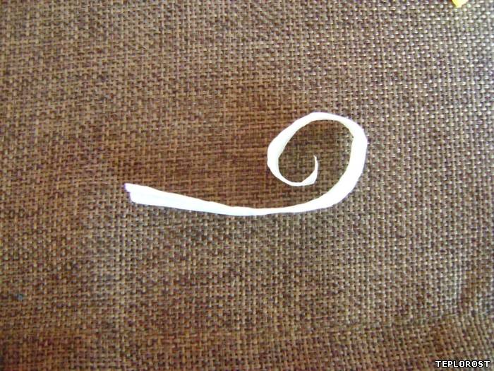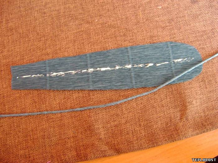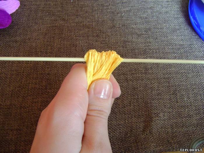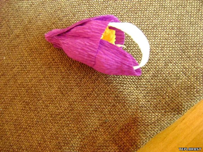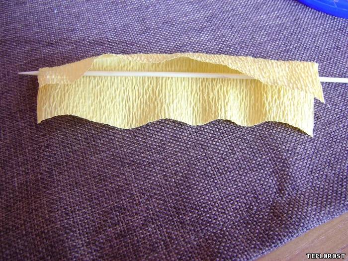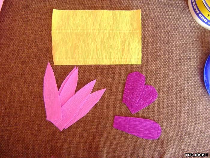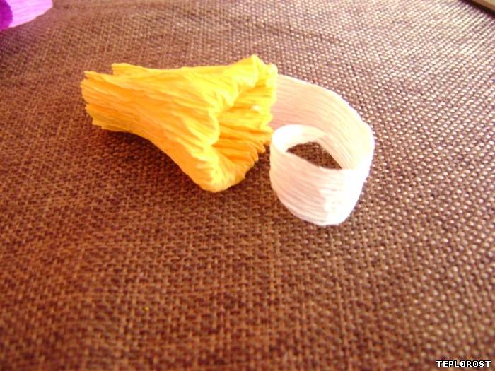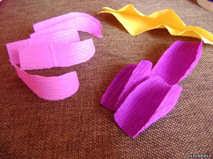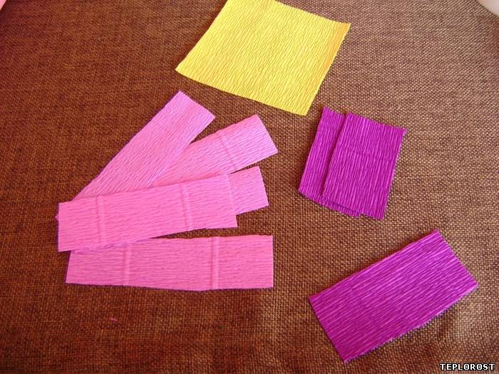 Гофрированная бумага желтого цвета - 7 x 14 см, бледно-розового 3 на 8 см, фиолетовая бумага - 3 на 7 и 3 на 4 см, белая бумага - 1,5 х 7 см