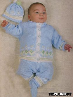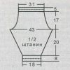 На спицы № 2,5 нитью синего цвета набрать 46 п. Вязать 4 см лиц. гладью, затем резинкой 1 лиц. скрещ. п. х 1 изн. п. 4 р. нитью белого, по 2 р. нитью желтого, белого и зеленого и 4 р. нитью белого цветов. Далее вязать лиц. гладью 1 р. нитью синего цвета - в этом р. равномерно прибавить 20 п., выполнить белую часть узора 1 и вязать нитью синего цвета до окончания. Для скосов прибавить от высоты 8 см с обеих сторон в каждом 3-м р. 17 раз по 1 п. На высоте 20 см закрыть с обеих сторон в каждом 2-м р. 4 п., 3 п., 2 п., 1 п. На высоте 45 см вязать 2,5 см резинкой 1 лиц. скрещ. п. х 1 изн. п., 1 р. изн. гладью, 2,5 см резинкой 1 лиц. скрещ. п. х 1 изн. п. и закрыть п. Над выполненным узором нитью желтого цвета вышить короткими стежками через 2 п. верхнюю часть узора 1. Вторую штанину вязать таким же способом. Выполнить швы, верхние 2,5 см загнуть внутрь по изн. р. и пришить, первые 4 см на резинках сшить по лиц. стороне, до этой высоты загнуть штанины в трубочки. В кулиску продеть эластичную тесьму.