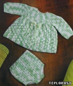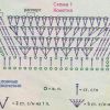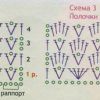 Платье Вязать как одну деталь, начиная с выреза горловины. Для кокетки набрать цепочку из 50 в. п. и вязать узором по схеме 1. Начиная с 4-го р. повторять 2 раза 3-й и 4-й р., затем связать 1 раз 3-й р. = 9 р. Итого 77 раппортов и по 5 п. с обеих сторон для планок застежки, которые вязать ст. с/н. Разделить вязание след, образом: 5 п. планки и 11 раппортов — прав, полочка спинки, 16 раппортов - прав, рукав, 23 раппорта — перед, 16 раппортов — лев. рукав, 11 раппортов и 5 п. планки — лев. полочка спинки. Вязать рукава узором по схеме 2, убавляя с обеих сторон в каждом 3-м р. 3 раза по 1 п. = 12 раппортов. Через 16 см от кокетки сшить рукава, связать 2 р. ст. б/н и закончить вязание. Полочки спинки и перед вязать узором по схеме 3. Через 22 см закончить вязание.