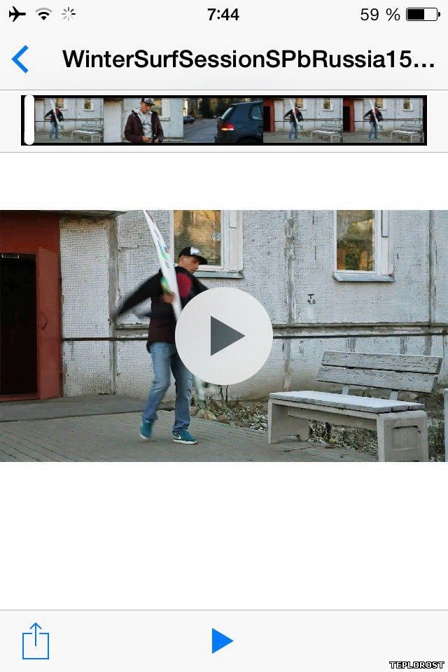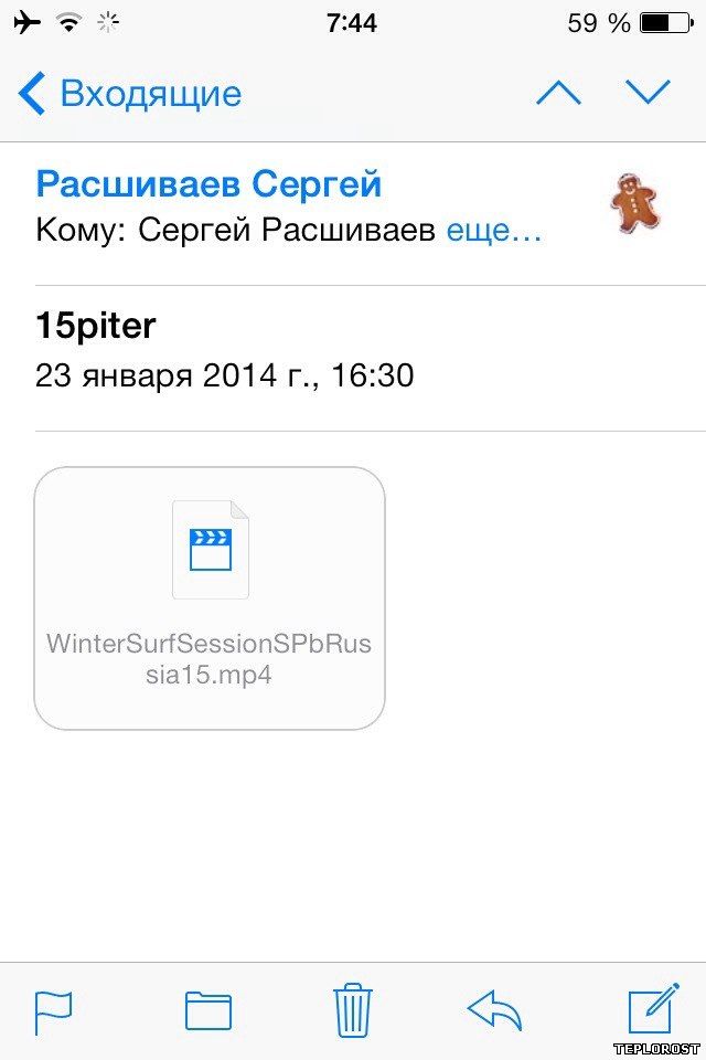 1)Отправьте готовое видео себе на почту. Потом зайдите в стандартную программу Mail на айфоне и скачайте его. Вы увидите такую картинку. Нажмите на видео и оно откроется. Что бы скачать нажмите на квадратик со стрелкой, он внизу под видео.