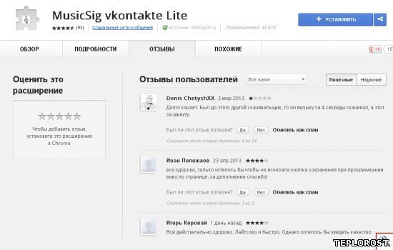 4. Нажмите кнопку «Установить», которая находится справа. Так вы установите расширение (плагин для chrome). Другие расширения для ВКонтакте, которые также используются для того, чтобы скачать музыку, мы кратко рассмотрим в конце статьи. Желательно иметь 1-2 подобных плагина, но нужно заранее узнать отзывы о них — с нажмите на левую кнопку мыши по блоку с расширением и в появившемся окне выберите вкладку «Отзывы». Рекомендуем всегда читать отзывы, чтобы иметь представление о том или ином плагине, прежде чем его скачать.