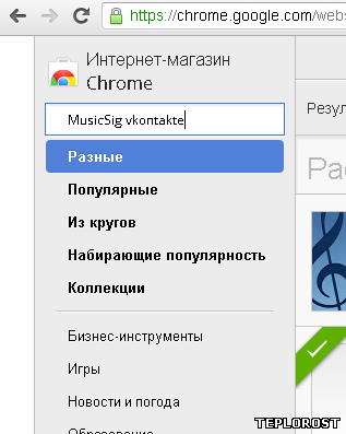 3. Далее, нам нужно будет установить специальное расширение (плагин) для браузера Хром, чтобы скачать музыку ВКонтакте. Для этого зайдите на сайт магазина Google Chrome. В левой верхней части открывшейся страницы находится строка поиска. Введите в ней запрос «MusicSig vkontakte» (без кавычек). Нажмите кнопку Enter.