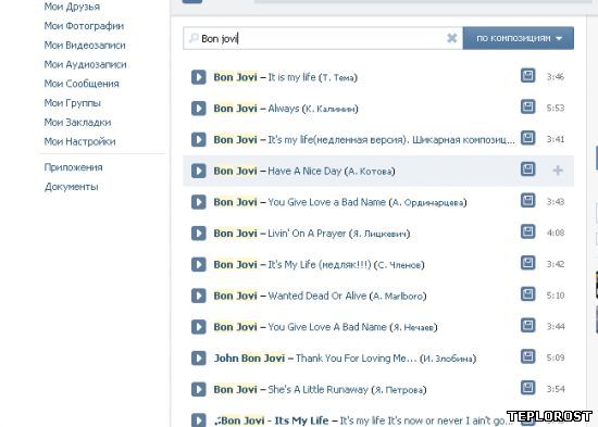 5. Итак, расширение установлено, теперь перейдем на сайт ВКонтакте. Выбираем Мои Аудиозаписи и видим, что напротив каждой композиции справа расположен значок дискеты. Точно так же будет, если вы введете в поиске ВК любой запрос по музыке:
