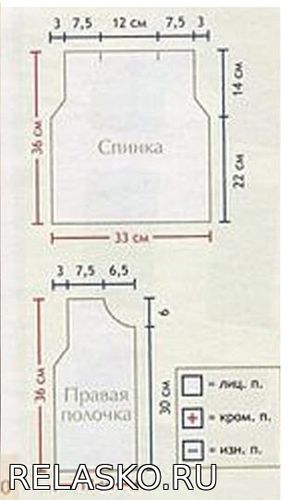 Спицами №3.5 набрать 51 (54) нетель, провязать 6 рядов лицевой гладью и распределить дальше петли так: 9 петель скрещенной резинкой, 1 (2) петель лицевой глади, 18 петель косой, 2 (3) петель лицевой глади, 18 петель ажуром, 3 (4) петли лицевой глади. На общей высоте 18 (20) см после первых 3 петель сделать 1 отверстие для пуговицы, сделать еще одно на расстоянии 8 (9) см от первого. Для каждого отверстия для пуговицы провязать 2 вместе лиц и 2 накида и 1 протяжку, в следующем ряду на 2 накидах вязать 1 лиц скрещенную и изн. На общей высоте 19(21) см для реглана закрыть 2 п и продолжить вязать, убавляя перед последними п в каждом 2-м ряду 16 (18) раз по 1 п. Для каждого убавления вязать