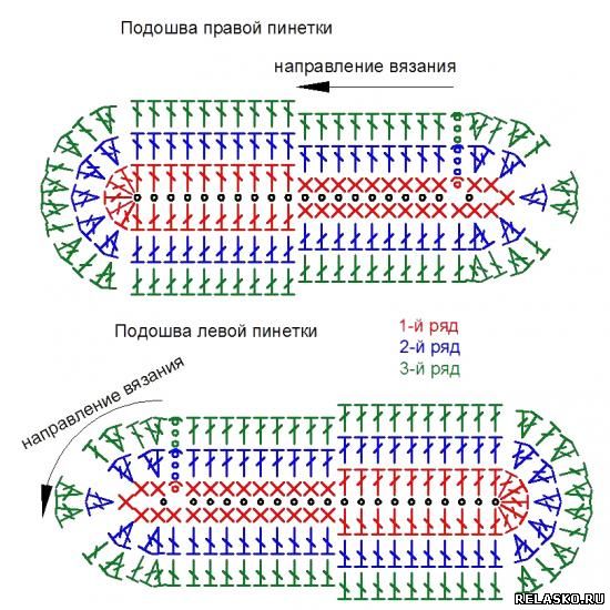 Ну а вот описание. Начинаем вязание с центра подошвы (см. схему для правой пинетки). Набираем белой ниткой 20 воздушных петель: 1-я петля – та, где остался «хвостик», 20-я – последняя, которую набрали, где находится крючок. Ряд 1. Делаем одну воздушную петлю, с 19-й воздушной петли вяжем по одному в каждую петлю 9 столбиков без накида и 9 столбиков с накидом, 7 столбиков с накидом – в первую петлю. С другой стороны косички из воздушных петель со второй петли вяжем по одному в каждую петлю 9 столбиков с накидом и 9 столбиков без накида, 6 столбиков без накида – в последнюю петлю. Заканчиваем первый ряд соединительной петлей (просто протягиваем нить в воздушную петлю, с которой начинали ряд). Ряд 2. 3 воздушные петли, вяжем по одному в каждую петлю 19 столбиков с накидом. Следующие пять петель вязать так: по 2 столбика с накидом в каждую (т.е. получится 10 столбиков с накидом). Далее – 20 столбиков с накидом. Пять последних петель – по 2 столбика с накидом в каждую. Заканчиваем ряд соединительной петлей. Ряд 3. 3 воздушные петли, 19 столбиков с накидом (в каждую петлю); 2 столбика с накидом в одну петлю, 1 столбик с накидом, 2 столбика с накидом в одну петлю, 1 столбик с накидом, 2 столбика с накидом в одну петлю, 2 столбика с накидом в одну петлю, 1 столбик с накидом, 2 столбика с накидом в одну петлю, 1 столбик с накидом, 2 столбика с накидом в одну петлю; 20 столбиков с накидом; 2 столбика с накидом в одну петлю, 1 столбик с накидом, 2 столбика с накидом в одну петлю, 1 столбик с накидом, 2 столбика с накидом в одну петлю, 2 столбика с накидом в одну петлю, 1 столбик с накидом, 2 столбика с накидом в одну петлю, 1 столбик с накидом, 2 столбика с накидом в одну петлю. Заканчиваем ряд соединительной петлей.