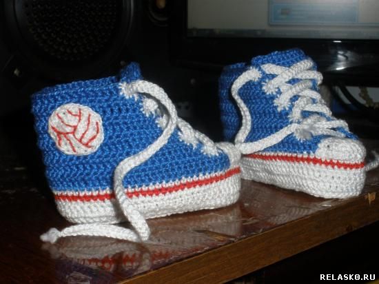 Во время беременности мне вдруг неудержимо захотелось вязать, хотя до этого вязала последний раз в школе, лет эдак 20 назад. Решила начать с чего-нибудь небольшого, ну и логично предположить, что выбор мой пал на пинетки для новорожденного. Хотелось чего-то необычного, и после поисков в интернете решила, что это должны быть кеды. И вот, что у меня получилось, можно сказать первая проба крючка