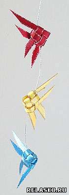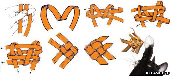 Возможно, помимо ленты Вам потребуется и немного клея, чтобы хорошо закрепить концы фигурки. Изначально такие рыбки изготавливались из пальмовых листьев в Тайланде, где они являются, можно так выразиться, народным промыслом. Мы же можем использовать таких рыбок в качестве подвесок в бижутерии, для изготовления открыток ручной работы, для украшения подарков, рамочек для фотографий, скрапбукинга, для украшения ёлки. А ещё с такими рыбками с удовольствием будет играть Ваша кошка! Для того, чтобы сделать одну рыбку, Вам понадобится 2 отрезка ленты примерно по 20 см длиной. Если Вы хотите сделать из сплетённых своими руками рыбок подобие гирлянды, которую Вы видите на фотографии слева, то помимо ленты Вам понадобится ещё и верёвочка или шнурок, на который будут крепиться рыбки. Для лучшего крепления используйте дополнительно по одной стоп-бусине на каждую рыбку (бусина будет спрятана внутри рыбки и не даст ей двигаться по верёвке). Описание работы: Возьмите один отрезок ленты и сделайте петлю, обматывая ленту свободно вокруг пальцев, как это показано на первом рисунке схемы. Петля должна выглядеть (без пальцев) как на втором рисунке схемы. Теперь возьмите второй отрезок ленточки и переплетите его с первым, как показано на двух следующих картинках схемы (в первом ряду). Если Вы собираетесь делать гирлянду или просто подвешивать рыбку на верёвочку или резинку, пришло самое время вложить стоп-бусину или узелок в рыбку. Тяните за все четыре конца ленты, пока не получите готовую рыбку своими руками. Осталось лишь обрезать кончики лент наискосок, проклеить или опалить срез (если Вы использовали ленту, которая может начать распускаться)!