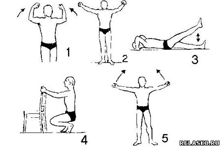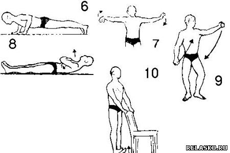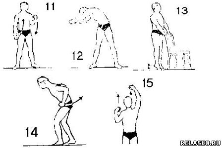 14. Поставьте ноги врозь и слегка согните их в коленях. Напрягая мышцы живота, наклоните туловище вперед, одновременно согните руки в локтях, напрягите бицепсы. Затем с напряжением трицепсов начинайте разгибать руки в локтевых суставах как можно дальше назад, имитируя отодвигание назад тяжести. Выпрямите туловище и опустите руки вниз. Во время наклона туловища делайте выдох, выпрямляясь - вдох.