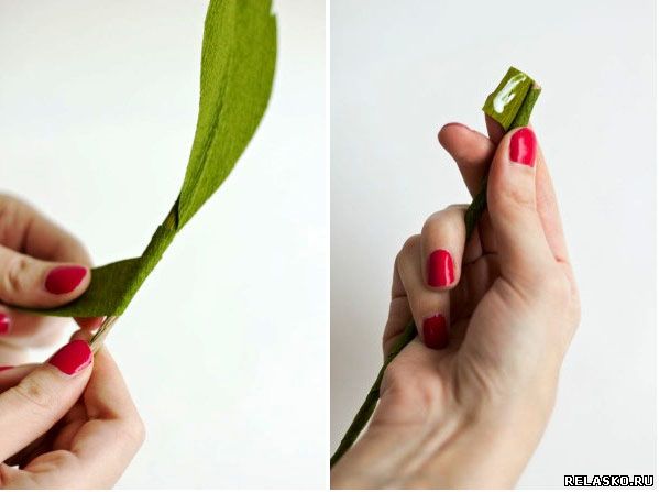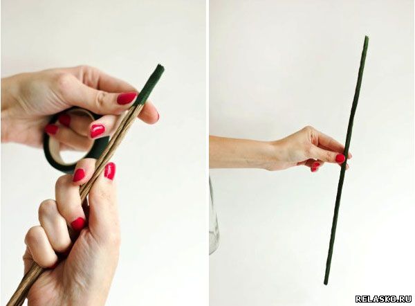 Делаем розы из гофрированной бумаги. Начинаем со стебля. Три провода оборачиваем томно-оливковой цветочной лентой.
