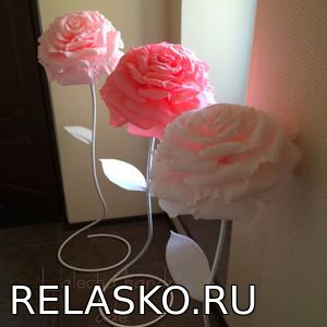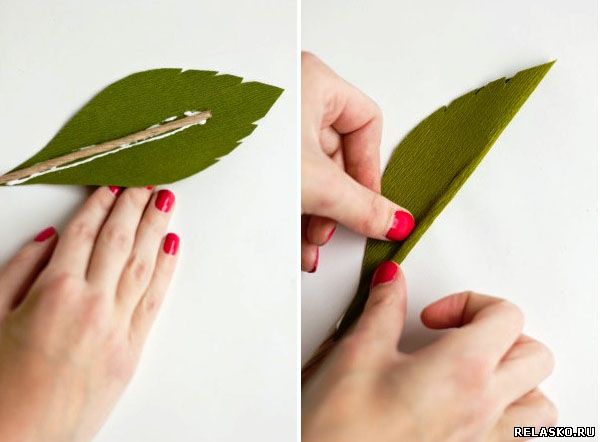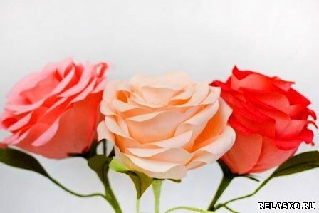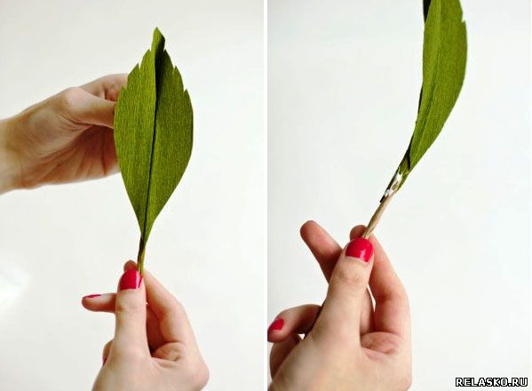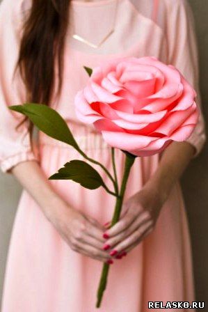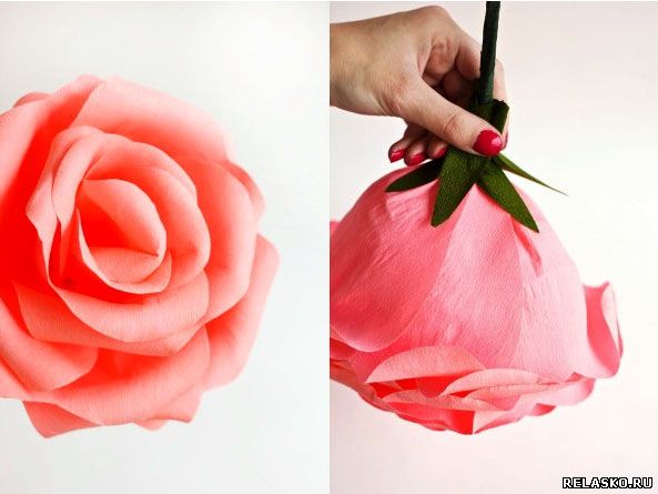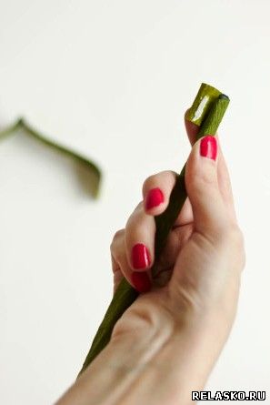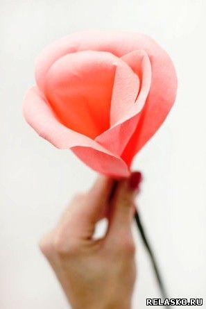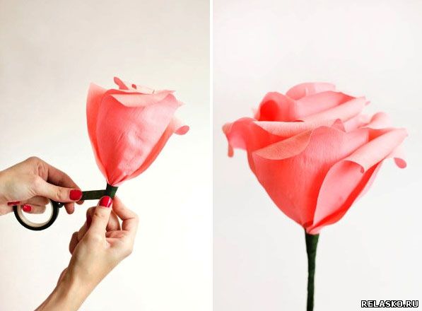В результате получается длинная полоса с изящными завитушками. Остаётся скрутить её в плотный бутон, и закрепить у основания ниткой. Из проволоки и флористической тесьмы, делаем стебель. Установив его в сердцевину, и расправив лепестки, получаем готовую розу. Источник: https://1igolka.com/rukodelie/kak-sdelat-bolshie-tsvetyi-iz-gofrirovannoy-bumagi
