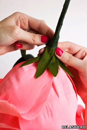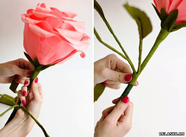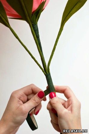 Далее переворачиваем розу и оборачиваем основание цветоложем. Закрепляем его цветочной лентой.
