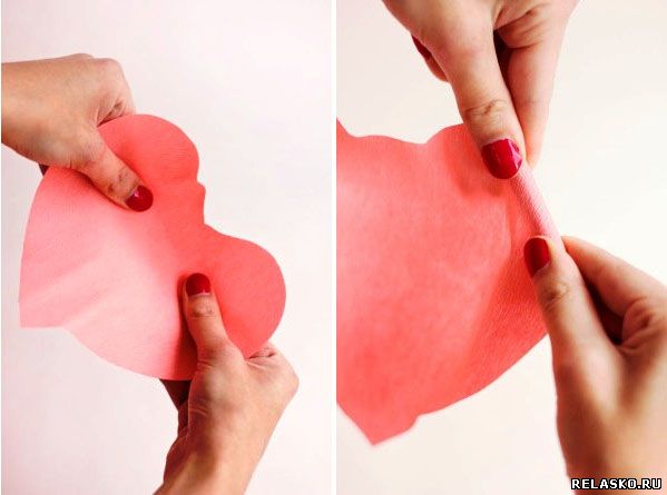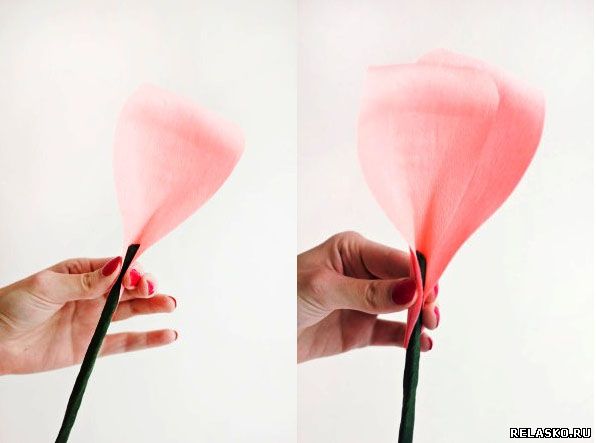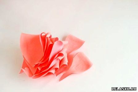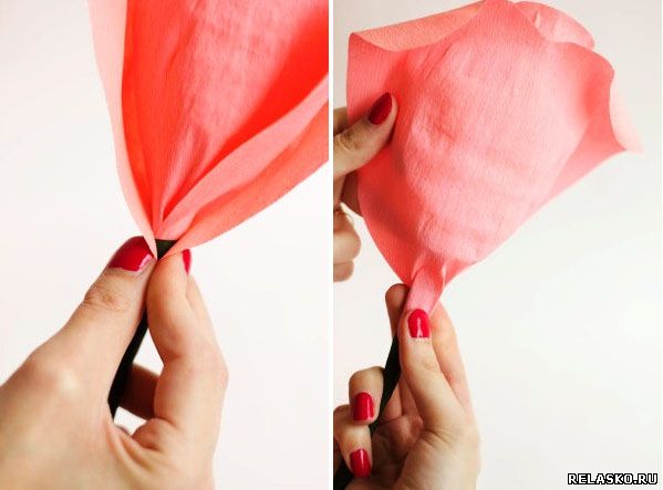 После малой растяжки по длине, берётся верхний правый угол нарезки, и пригибается внутрь. Придерживая низ образовавшегося треугольника большим пальцем правой руки, на указательный наматываем верхний край. Получается подобие наплыва.