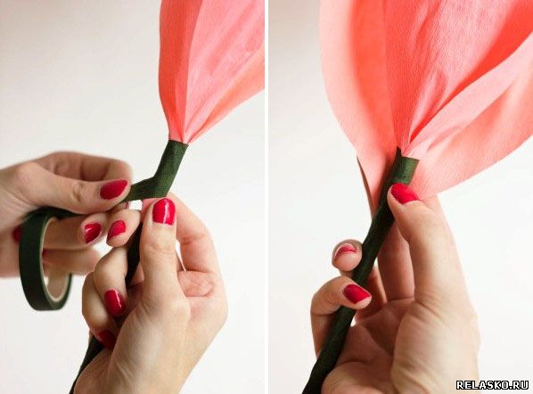 Крепим большие лепестки по тому же принципу. Обернув 4-5 лепестков, закрепляем их основания к стержню с помощью цветочной ленты и продолжаем формирование цветка.
