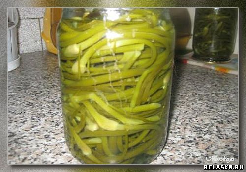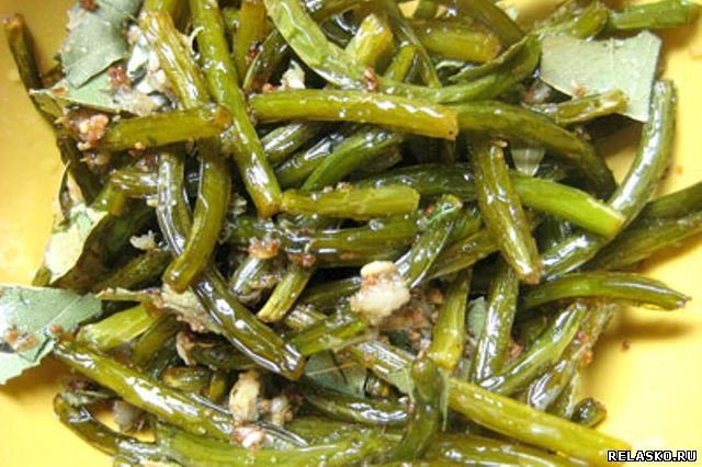 Как приготовить стрелки чеснока в маринаде по-корейски стрелки нарезать палочками (длина 4-6 см) до бутонов (бутоны выбросить, перья чеснока, растущие после бутона можно использовать в другие салаты); масло разогреть в сковороде (слой в 1 см), обжарить стрелки, периодически помешивая, до смягчения; добавить сахар, мелко наломанный лавровый лист, приправу для корейской моркови, уксус.