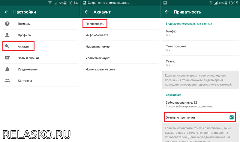 Откройте WhatsApp и коснитесь трех точек в правом верхнем углу, затем выберите “Настройки” => “Аккаунт” => ”Приватность” и снимите галочку с пункта “Отчеты о прочтении”.