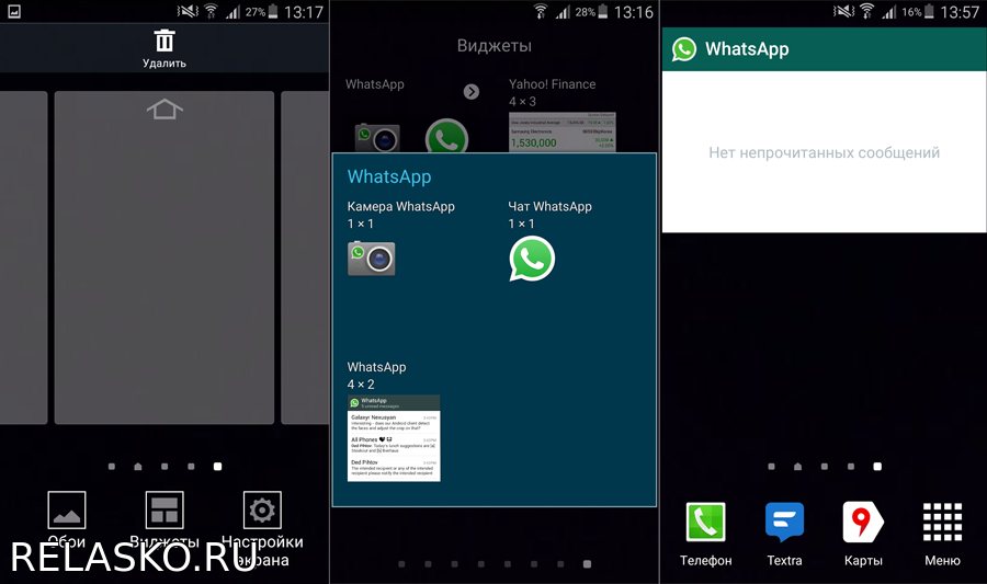 Чтобы добавить виджет WhatsApp на экран смартфона Android, коснитесь чистой области экрана и не отпускайте пару секунд. Затем выберите пункт “Виджеты”. В открывшемся списке найдите виджет WhatsApp, листая страницы с виджетами и коснитесь его. В появившемся окошке найдите виджет “WhatsApp 4 х 2”, затем коснитесь его и перетащите в нужное место на экране телефона.