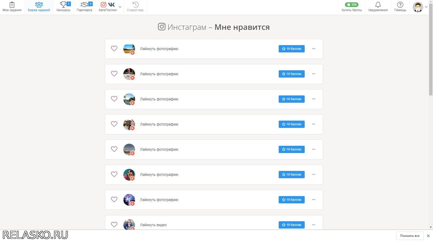 Здесь вы видите все задания от пользователей, которые платят баллы, за то, что бы вы лайкнули их пост.