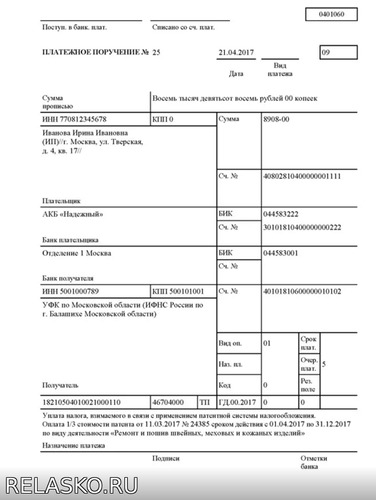 Образец заполнения платежки для уплаты патента индивидуального предпринимателя в 2018 году