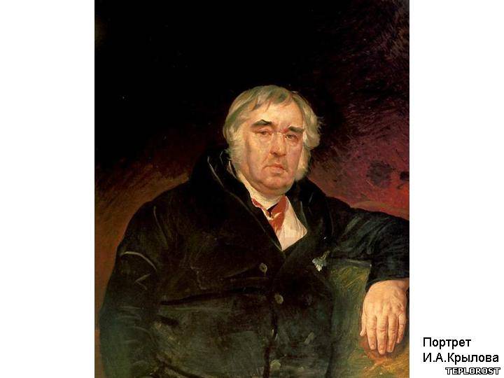 Крылов Иван Андреевич, русский писатель, баснописец, журналист, родился 13 февраля 1769 г. в Москве в семье отставного офицера. Детские годы писателя прошли в Твери и на Урале. Правильного образования он так и не получил. Семья его жила очень бедно, еще подростком Крылов вынужден был поступить на службу в канцелярию земского суда на должность подканцеляриста. В 1782 г. Крылов переезжает в Петербург, где устраивается на работу мелким чиновником в Казенной палате.