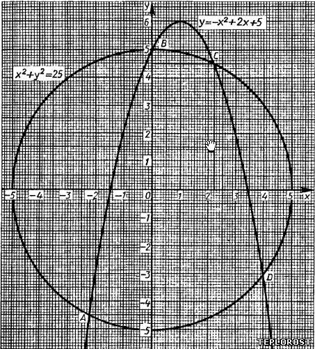 Построим графики первого и второго уравнений в одной системе координат. Графиком первого уравнения будет окружность с центром в начале координат и радиусом 5. Графиком второго уравнения будет являться парабола с ветвями, опущенными вниз.