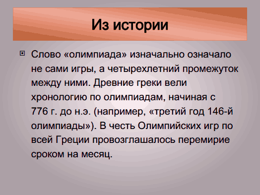 Слово «олимпиада» изначально означало не сами игры, а четырехлетний промежуток между ними. Древние греки вели хронологию по олимпиадам, начиная с 776 г. до н.э. (например, «третий год 146-й олимпиады»). В честь Олимпийских игр по всей Греции провозглашалось перемирие сроком на месяц.