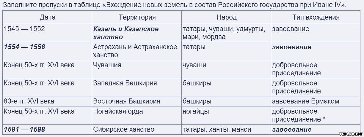 Заполните пропуски в таблице «Вхождение новых земель в состав Российского государства при Иване IV».