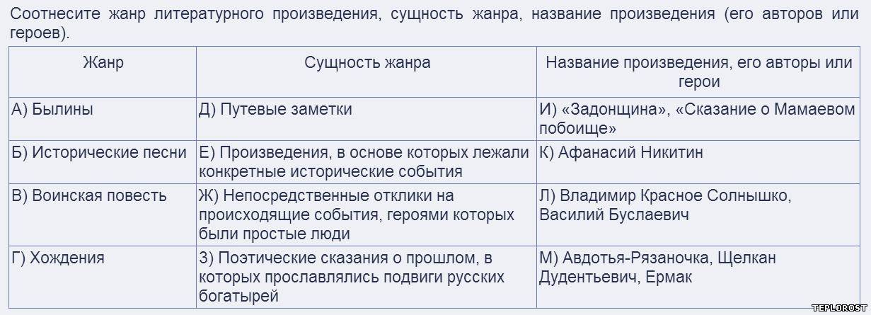 Соотнесите жанр литературного произведения, сущность жанра, название произведения (его авторов или героев).