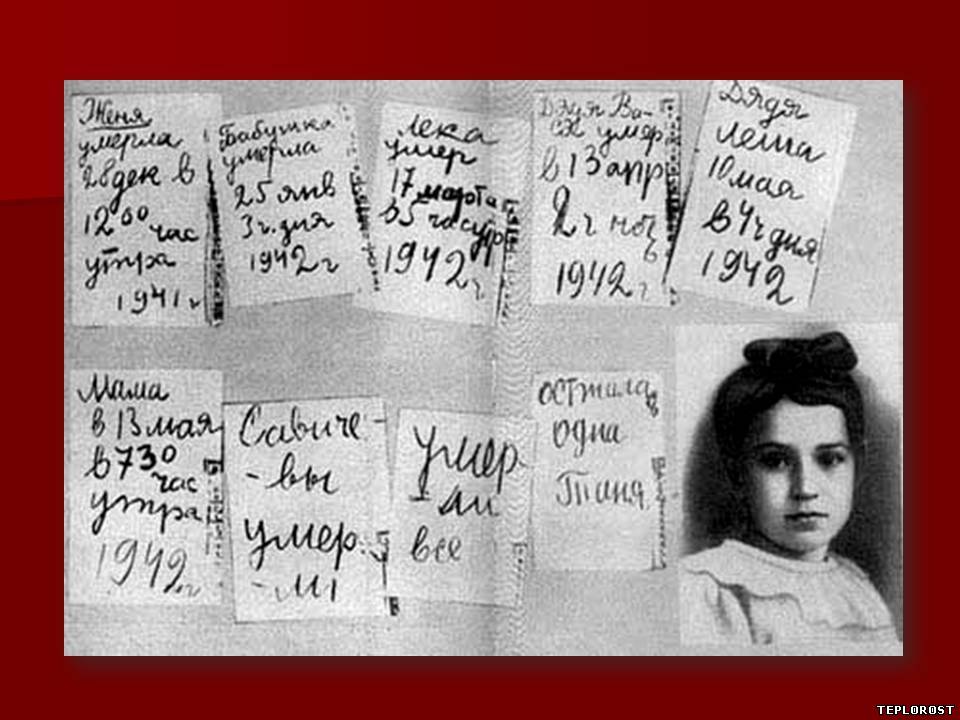 Дневник Тани Савичевой. Двенадцатилетняя ленинградка Таня Савичева начала вести свой дневник чуть раньше Анны Франк, жертвы Холокоста.