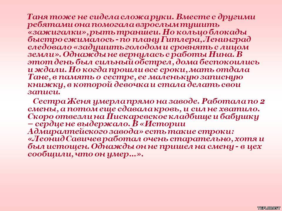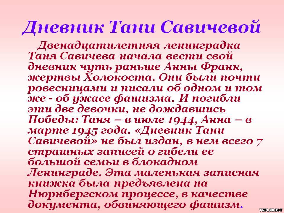 Они были почти ровесницами и писали об одном и том же - об ужасе фашизма. И погибли эти две девочки, не дождавшись Победы: Таня – в июле 1944, Анна – в марте 1945 года. «Дневник Тани Савичевой» не был издан, в нем всего 7 страшных записей о гибели ее большой семьи в блокадном Ленинграде.