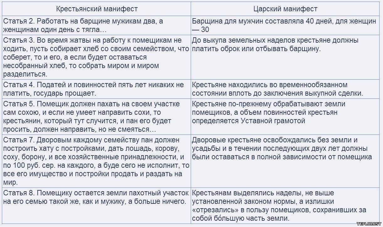 Многие крестьяне не хотели верить тому, что было написано в царском манифесте. Среди крестьян появлялись люди, которые убеждали их в том, что царский манифест подменен чиновниками, и предлагали свои толкования этого документа. Прочитайте «Манифест о воле», составленный крестьянами Лебединского уезда Харьковской губернии в апреле 1861 г. Напротив статей крестьянского манифеста запишите, какие меры были предусмотрены по этим проблемам в правительственном варианте.