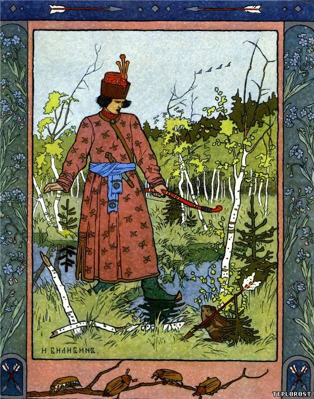 - Можно ли догадаться, что это царский сын? Опишите одежду Ивана-царевича. (длинный (народный русский) кафтан, подпоясан кушаком, шапка с отворотом, сафьяновые сапоги, держит лук…)