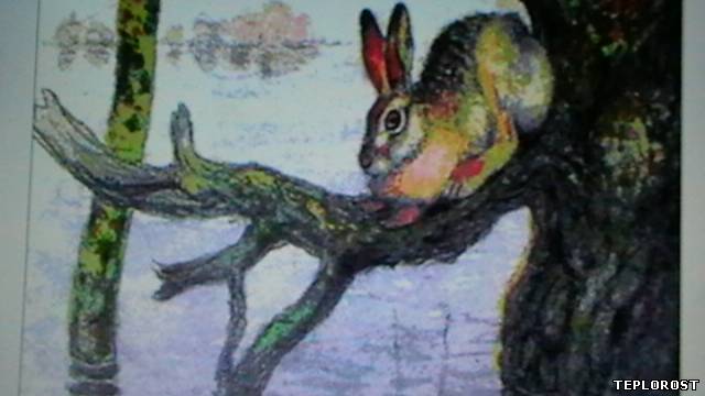 На картине «Наводнение» художник изобразил зайца, который спасается от весеннего паводка на ветке дерева.