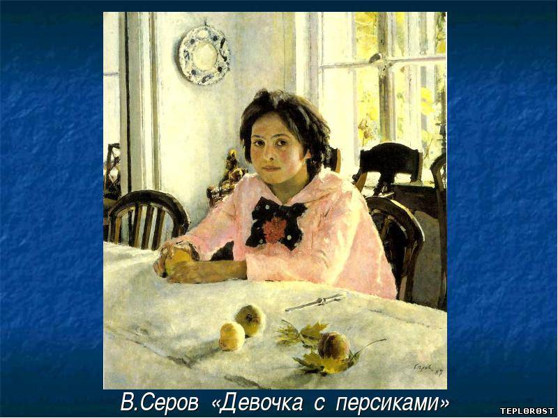 Картина "Девочка с персиками" - одно из первых произведений В. А. Серова. На картине изображена дочь известного промышленника и купца Саввы Мамонтова - Вера Мамонтова. Загорелая девушка пристально смотрит на зрителя с полотна. У нее большие и темные глаза с тайным огоньком. Можно подумать, что девушка задумала какую-то шалость, кажется, что в серьезно сжатых губах таится намек на лукавство.