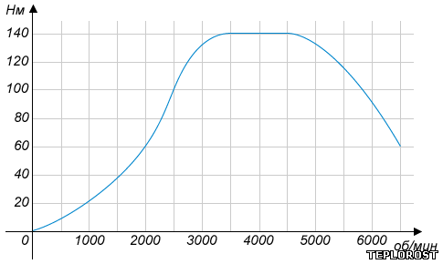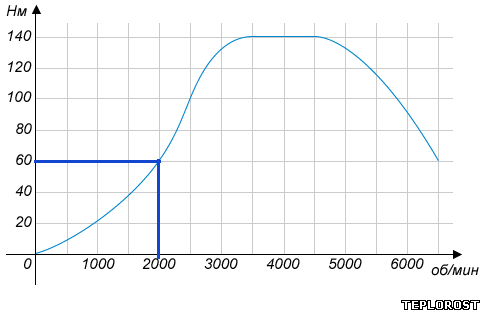 Автомобиль начнет движение при минимальном крутящем моменте равном 60 H⋅м, который достигается при 2000 оборотах в минуту.