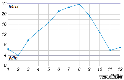 Максимальная среднемесячная температура в 1920 году в Сочи была зафиксирована в восьмом месяце и составляла 24 градуса Цельсия, а минимальной среднемесячная температура в этом году была во втором месяце и равнялась 4 градусам Цельсия. Таким образом, разность между максимальной и минимальной среднемесячной температурой равна 20 (24−4=20).
