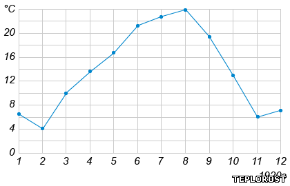 На рисунке жирными точками показана среднемесячная температура воздуха в Сочи за каждый месяц 1920 года. По горизонтали указываются месяцы, по вертикали — температура в градусах Цельсия. Для наглядности жирные точки соединены линией.