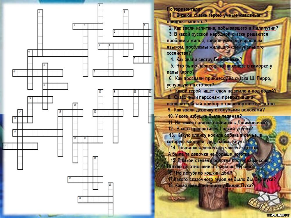 1. В какой сказке герою умные животные приносят монеты? 2. Как звали капитана, побывавшего в Лилипутии? 3. В какой русской народной сказке решаются проблемы жилья, говоря умным, взрослым языком, проблемы жилищно-коммунального хозяйства? 4. Как звали сестру Белоснежки? 5. Что было нарисовано на холсте в каморке у папы Карло? 6. Как прозвали принцессу из сказки Ш. Перро, уснувшую на сто лет? 7. Какой герой ищет ключ на земле и под водой? 8. Сказочный персонаж, превративший нагревательный прибор в транспортное средство. 9. Как звали девочку с голубыми волосами? 10. У кого избушка была ледяная? 11. Из какого цветка появилась Дюймовочка? 12. В кого превратился Гадкий утенок? 13. Какую кличку носила собака в семье, в которую входили: дед, бабка, внучка? 14. Появилась девочка в чашечке цветка, А была та девочка не больше ноготка. 15. В какой степени родства состояла миссис Поттер по отношению к миссис Дурсли ? 16. Что погубило кошкин дом? 17.Какого сказочного героя не было бы без муки? 18. Какая фамилия была у Винни-Пуха?