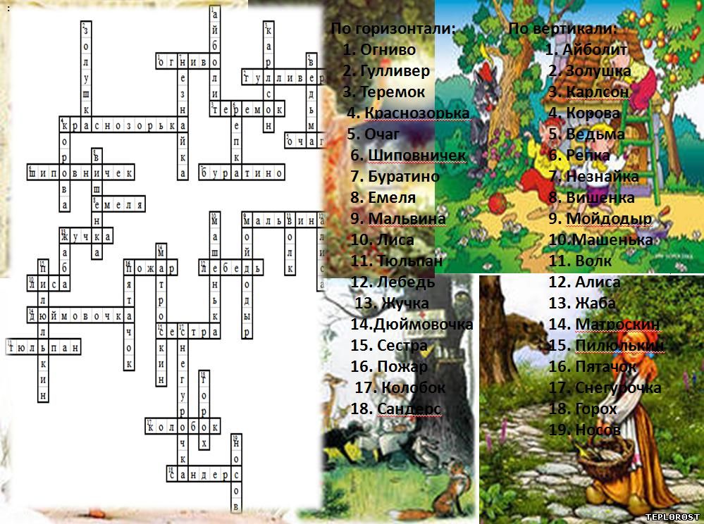 1. Кто непременно должен был попасть в Лимпопо? 2. Очаровательная молодая незнакомка, сбежавшая с бала в полночь и потерявшая на ступеньках дворца волшебную туфельку 3. Он большой шалун и комик, У него на крыше домик. 4. Кто помогал героине сказки «Крошечка-Хаврошечка»? 5. Кто помог Русалочке обрести две стройные ножки? 6. Героиня русской народной сказки, которая была сельскохозяйственным продуктом? 7. Самый известный житель Цветочного города. 8. Принца из сказки «Чиполлино» звали… 9. В какой сказке встречаются мыло, полотенце и другие предметы личной гигиены? 10. Как звали девочку, которая пошла погулять, заблудилась, зашла в чужой дом, где жили медведи? 11. Какой герой русской народной сказки ловил рыбу очень оригинальным способом? 12. Как звали девочку, путешествовавшую по Стране чудес и Зазеркалью? 13. Министра в сказке «Королевство кривых зеркал» на самом деле звали… 14. Как звали кота из сказок про дядю Федора из Простоквашино? 15. Как звали доктора из книги Н. Носова "Приключения Незнайки и его друзей"? Кто ходил вместе с Винни-Пухом в гости к кролику? Герой русской народной сказки, который растаял от огня. 18. Это растение помогло принцу отыскать настоящую принцессу. 19. Фамилия автора книги «Приключение Незнайки и его друзей»