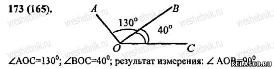 Постройте угол А ОС, равный 130°. Проведите внутри угла АОС луч ОВ так, чтобы 18-07-37.jpgBOC=40°. Измерьте угол АОВ.