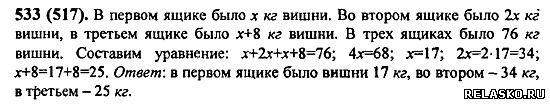 В трех ящиках было 76 кг вишни. Во втором ящике было в 2 раза больше, чем в первом, а в третьем — на 8 кг больше вишни, чем в первом. Сколько килограммов вишни было в каждом ящике?