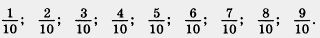 Читаем: одна пятая, одна восьмая, десять одиннадцатых, двенадцать двадцать третьих, двадцать пятьдесят седьмых, одна шесдясять первая, одиннадцать сто двадцатых, сто двести семьдесят седьмых, пятнадцать пятьсот восемьдесят вторых.
