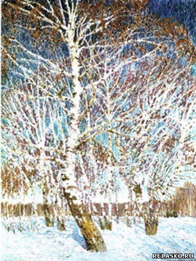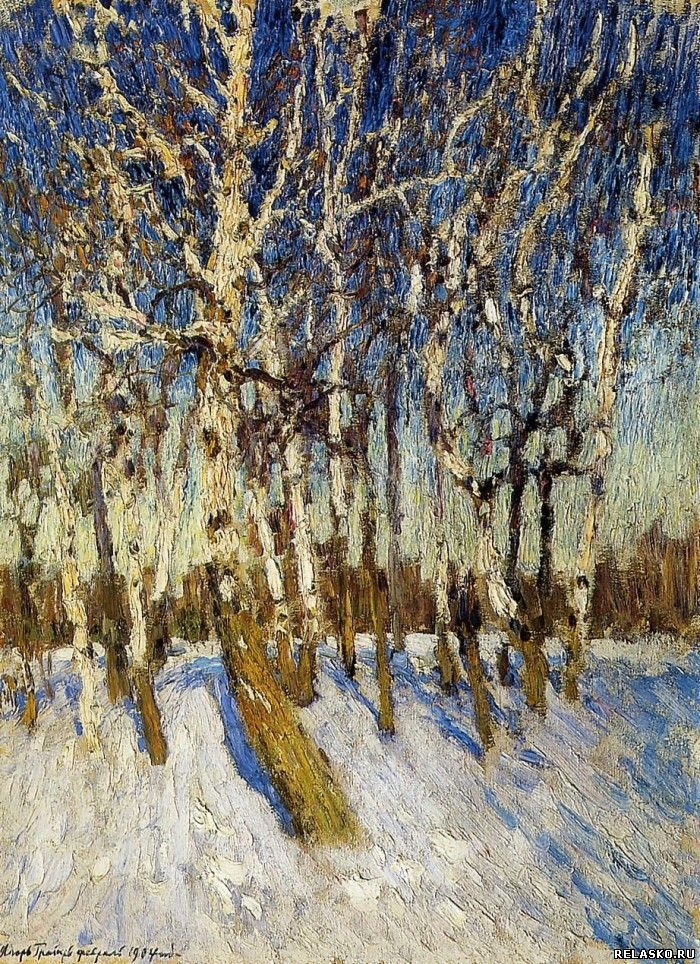 Под деревьями лежал снег, блестя и переливаясь под лучами солнца, а на нём вырисовывались синие тени берез. Белый снег делается голубым, потому что безоблачное небо разливает свои краски повсюду. Вдалеке темнеет прозрачный лес, он замер в тишине. Летом он был таким густым, что не было видно сквозь него неба. А сейчас он прозрачен и тих.