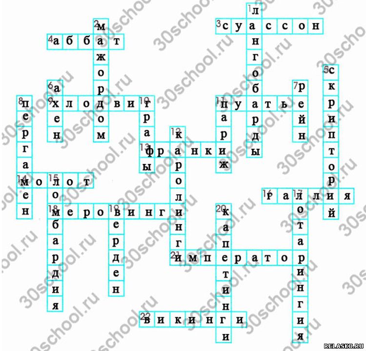 По горизонтали. 3. Город, около которого римляне потерпели поражение от франков. 4. Глава монастыря. 9. Первый правитель государства франков. 11. Город, у которого франки разбили арабов. 13. Германцы, покорившие Галлию. 14. Прозвание знатного франка, победителя арабов (в переводе на русский язык). 16. Римская провинция, завоёванная франками. 18. Династия первых франкских правителей. 21. Новый титул Карла Великого. 22. Участники морских походов из Скандинавии.