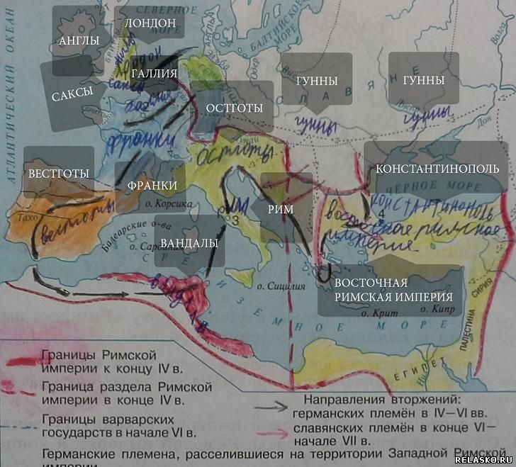 Обведите границы Римской империи к концу IV века. Обозначьте границу раздела Римской империи в конце IV века Раскрасьте различными цветами стрелки, указывающие направления вторжений: а) германских племен в IV-VI веках; б) славянских племен в конце VI - начале VII века. Раскрасьте различными цветами территории: а) Восточной Римской империи; б) варварских государств - англов и саксов, вандалов, вестготов, остготов, франков. Подпишите названия германских племен, расселившихся на территории Западной Римкой империи. Подпишите названия: Галлия, Западная Римская империя, Восточная Римская империя. Подпишите на карте названия городов, обозначенных цифрами.
