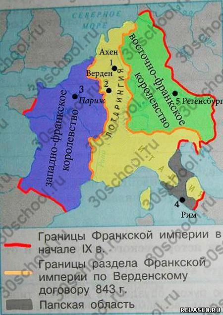 Автор: Олег Гречина Обведите границы Франкской империи в начале IX века. Обозначьте границы раздела Франкской империи по Верденскому договору. Раскрасьте различными цветами территории государств, образовавшихся в результате раздела Франкской империи. Подпишите названия тех из них, которые вам известны. Закрасьте территорию Папской области. Подпишите на карте названия городов обозначенных цифрами.